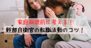 家庭崩壊前に考える!幹部自衛官の転職活動のコツ! 転職を考えている幹部自衛官の多くが抱える悩みです。仕事の激務に追われ、家庭にしわ寄せが来てしまう。家族との関係が悪化し、家庭崩壊の危機を感じている方も少なく...